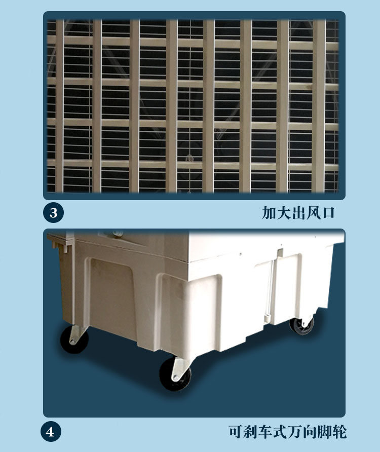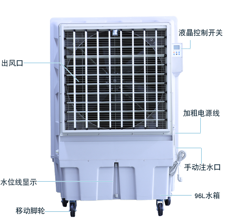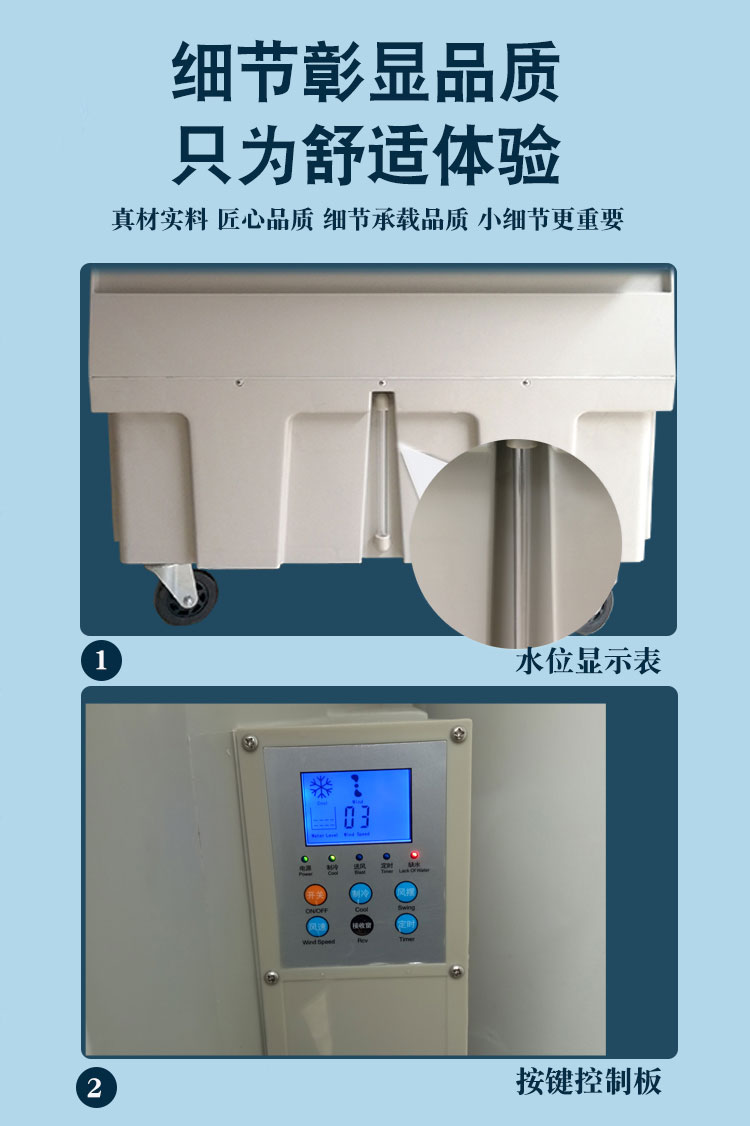 1:KT-1B-H6冷风机外壳采用是改性PP料。 2:机器六片增强尼龙加纤风叶风量大 风距远。 3:晨雾KT-1B-H6左右自动摆风,上下手动。 4:机器电机支架采用铝支架不宜生锈。 5:机身自带96L大水箱不用频繁的加水。 6:液晶控制面板操作简单也可遥控操作。 7:纯铜电机使用寿命更长更耐用。